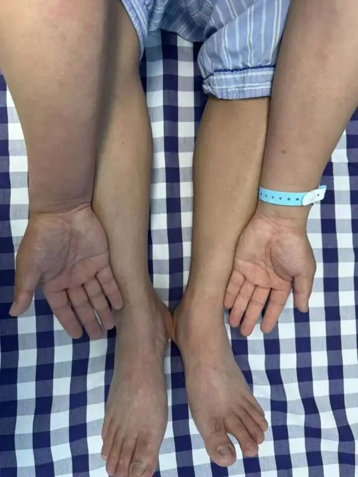 两天后,皮疹仍是扩张到了陈先生的行动,腹部和脚踝部位皆泛红了,当地病院遂将他转至杭州市中病院皮肤科选用诊疗。