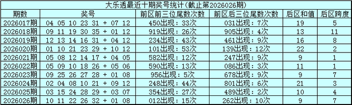 体彩大乐透第26026期奖号开出:10 11 22 26 32+01 08,福州配资门户前区奖号大小比为3:2,012路比为0:2:3,奇偶比为1:4,后区号码和值为9,跨度为7。
