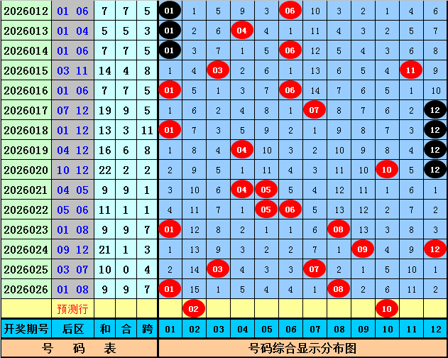 体彩大乐透第2026026期奖号为:10 11 22 26 32 + 01 08,前区号码和值为101,跨度为22,后区号码和值为9,跨度为7。