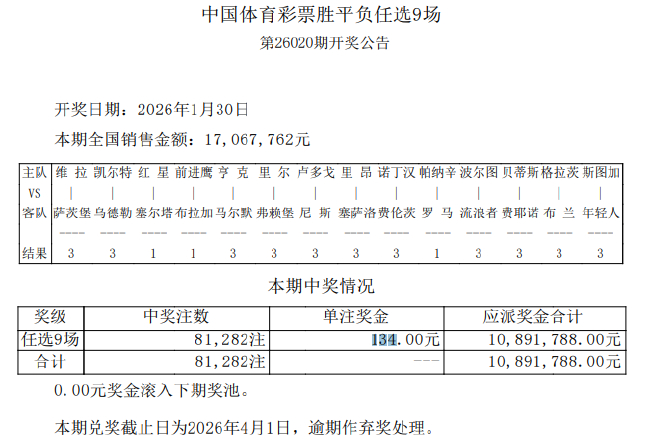北京时间1月30日,足彩第26020期任九开奖结果揭晓。任九开出81282注,单注奖金134元。本期任九总投注额为17,067,762元。