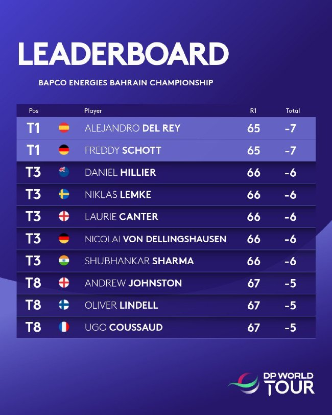 北京时间1月29日,在2026年巴林锦标赛首轮比赛中,西班牙选手亚历杭德罗-德勒雷(Alejandro del Rey)与德国选手弗雷迪-肖特(Freddy Schott)均交出65杆,低于标准杆7杆,以并列领先的姿态闪耀全场。