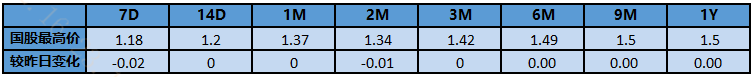 当天存单成交清淡。全期限来看国股即期收益率,6月底1.3725%,10月底1.45%,1月底1.4775%,足年1.4825%。