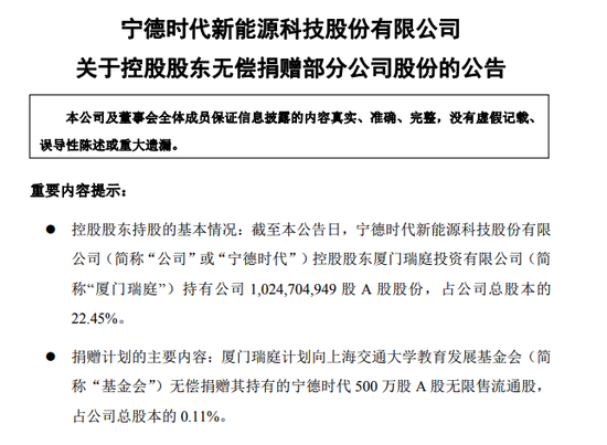3月31日,宁德时期晚间公告称,2026年3月31日,宁德时期新动力科技股份有限公司接到控股鼓吹厦门瑞庭投资有限公司奉告,其与上海交通大学磨真金不怕火发展基金会订立了《上海交通大学“曾毓群磨真金不怕火基金”捐赠公约书》,厦门瑞庭拟向基金会无偿捐赠其捏有的宁德时期500万股A股无穷售分解股。前述捐赠股份产生的一起收益及所得资金将一起注入“曾毓群磨真金不怕火发展基金”,用于撑捏上海交通大学磨真金不怕火行状发展。