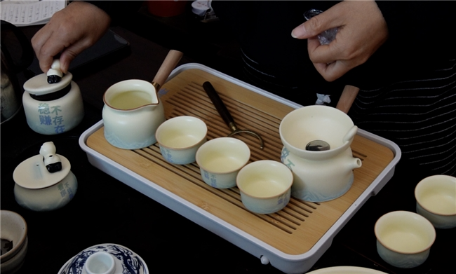 图说:妈妈的茶具上,印满着“稳赚不存在”“刷单不赚钱”等反诈提醒。