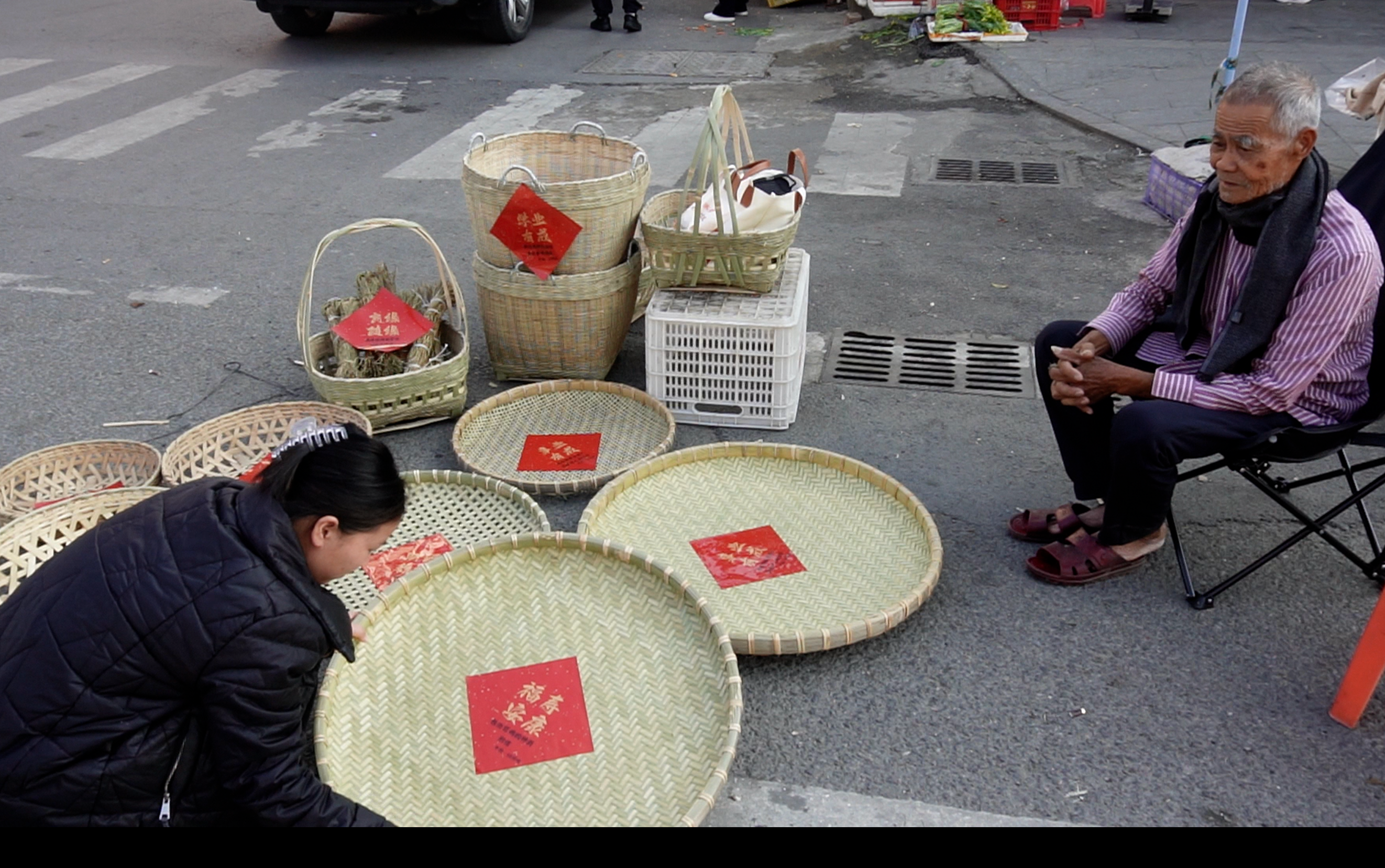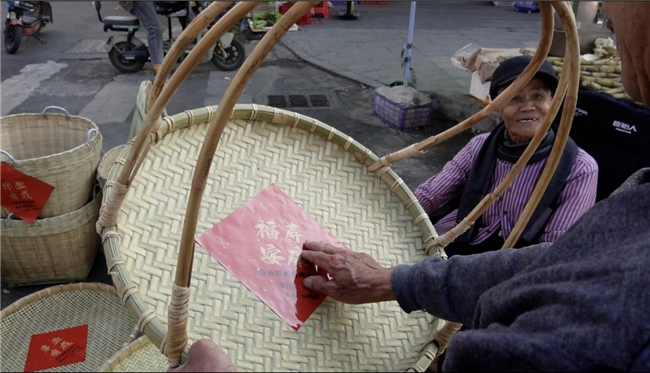 第二天,爷爷把年贴贴在他手工编织的竹编制品上,照常去了镇上的集市。“贴个好话,做个提醒,积福气了。”摆摊时,不少人停下来念年贴上的字,一边买东西,一边聊起身边听过、遇到的诈骗经历。