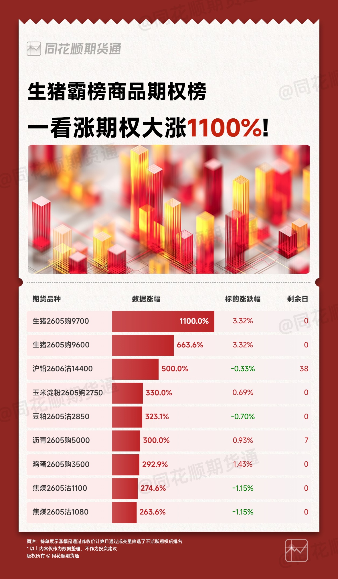 第 1 名:生猪2605购9700 +1100.00%第 2 名:生猪2605购9600 +663.64%第 3 名:沪铅2606沽14400 +500.00%