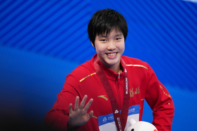 新华社像片,深圳(广东),2025年11月17日\n 11月17日,冠军河北队选手于子迪在授奖典礼后向不雅众致敬。\n 当日,第十五届宇宙开通会游水女子400米个东说念主搀和泳决赛在广东省深圳市举行。\n 新华社记者 丁增尼达 摄