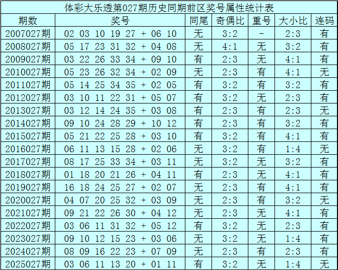 体彩大乐透第027期历史同时开出19次奖号,其统计详见下表: