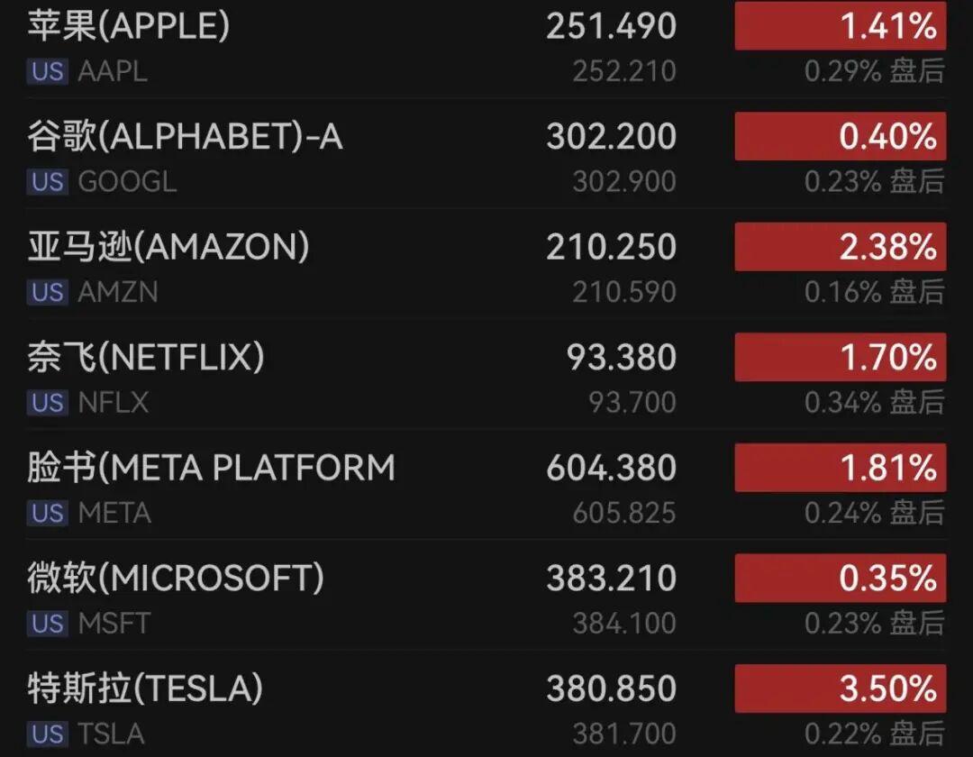 大型科技股集体高涨,特斯拉涨超3%,亚马逊涨逾2%,脸书涨近2%,英伟达、苹果涨超1%,谷歌涨0.4%,微软涨0.35%。