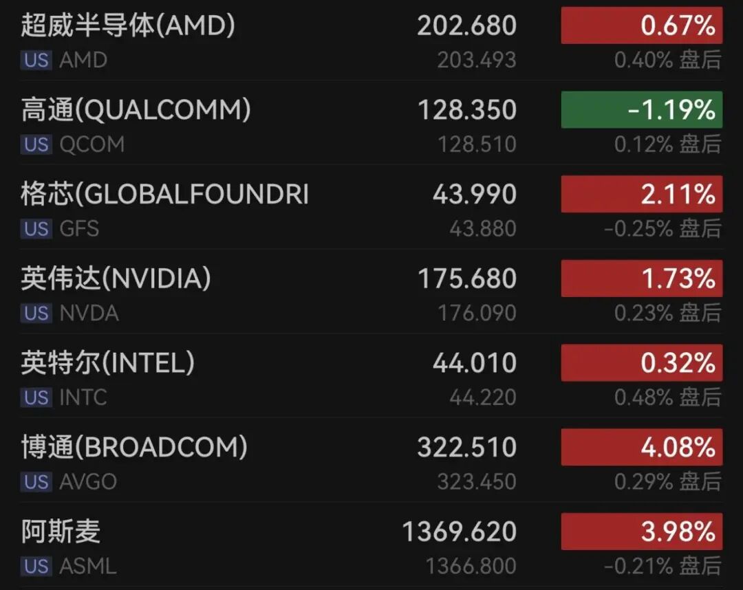 芯片股多数高涨,费城半导体指数涨1.34%,博通涨超4%,阿斯麦涨近4%,ARM涨超3%,台积电涨逾2%,好意思光科技跌超4%,高通跌逾1%。