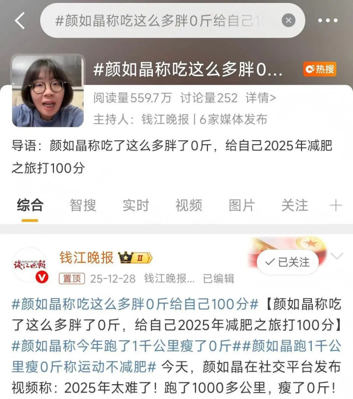 颜如晶写谈,2025年爬了许多山,进入了沙漠徒步和戈壁徒步,又解锁了半马和全马,最近还完成了一个142.7公里的东谈主车努力赛……可每次称体重,驱散仍与之前一样,偶然以至不掉还涨,“2026年要是又卡平台期的话,我要给我方一个布置,也要给减肥界一个真相。”